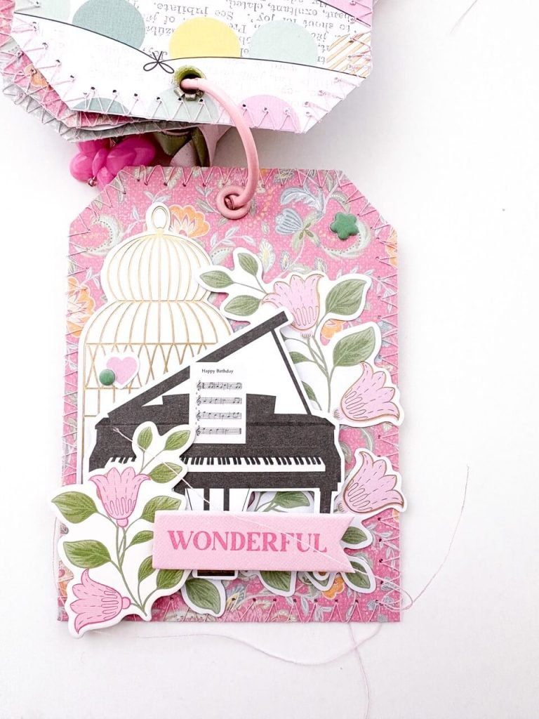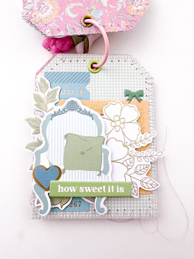 I started by cutting and stitching a set of tags using patterned papers from the 6×6 paper pad. The smaller scale of the designs makes them perfect for tags, giving each one a unique look while still coordinating beautifully as a set.