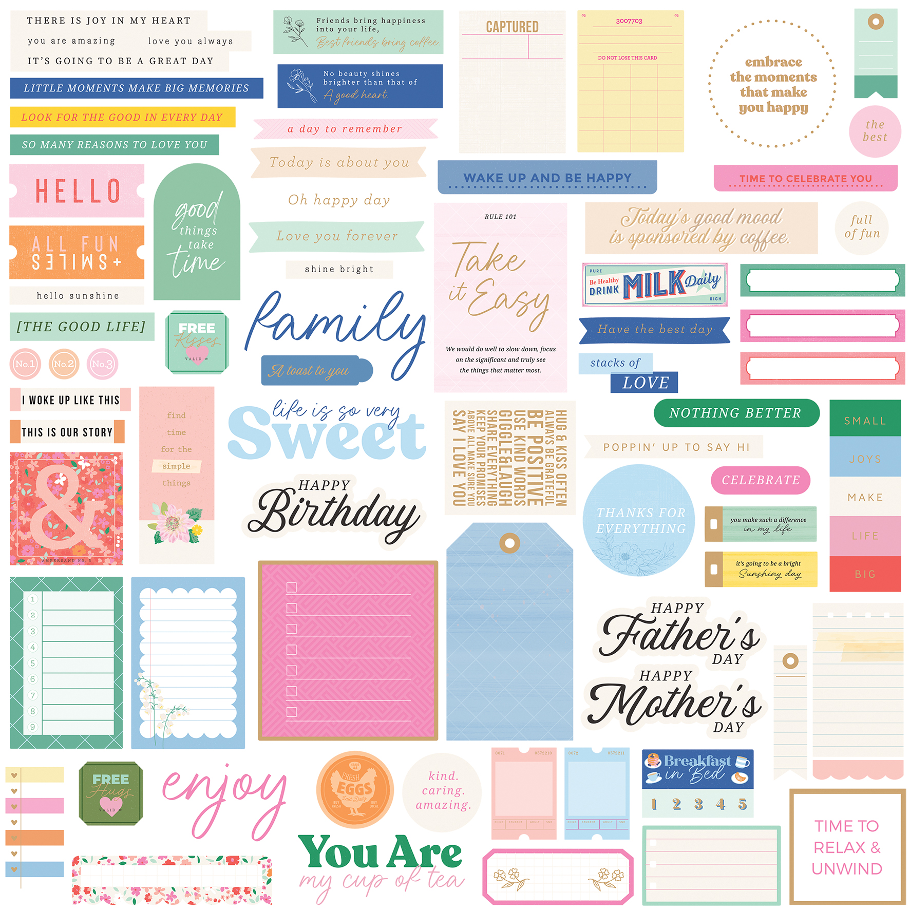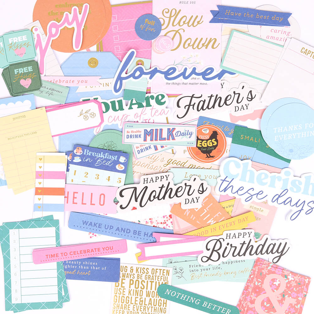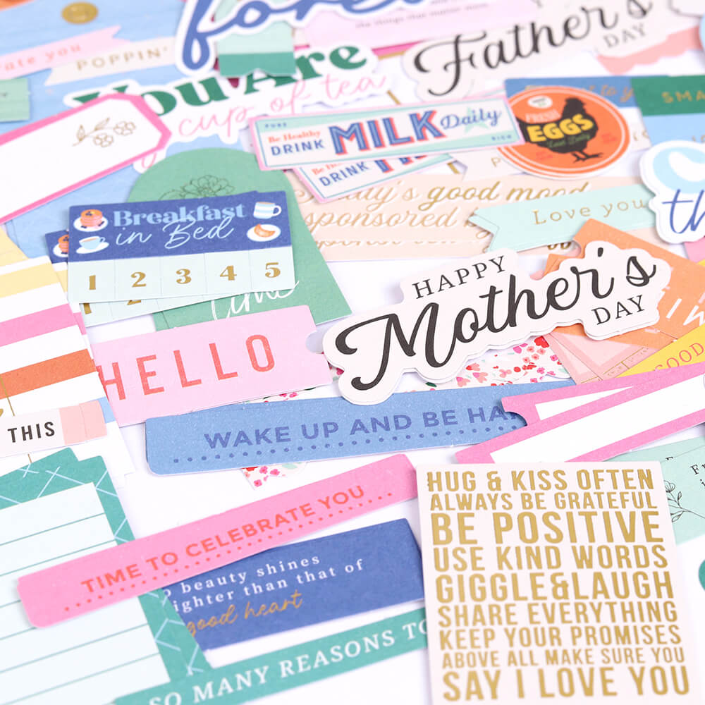 Brighten your projects with the Breakfast in Bed diecut cardstock sentiments. Filled with happy sayings about family, sunshine, and lazy days, these cheerful phrases are perfect for capturing moments that make you smile, from breakfast at home to a day celebrating someone who is just the best. This set includes 152 acid-free cardstock sentiments, with two of each design so you?ll always have the right words to share a little joy. Made from 180gsm, acid free, medium weight cardstock.